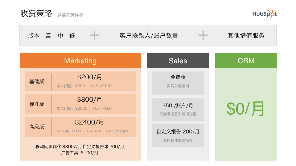 按不同版本:基础、高级和专业版,其中CRM和Sales有免费版(这为他们带来了大量的用户)。扩容收费:每个版本的客户数量有限制,如果想扩大,需额外收费,不同版本的扩容费用不一样,专业版的扩容会比较便宜,而基础版的扩容比较贵。增值服务:包括移动网站优化工具、自定义报告、广告分析等工具,这些服务均按月收费。三、运营模式