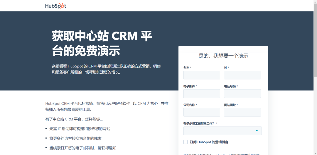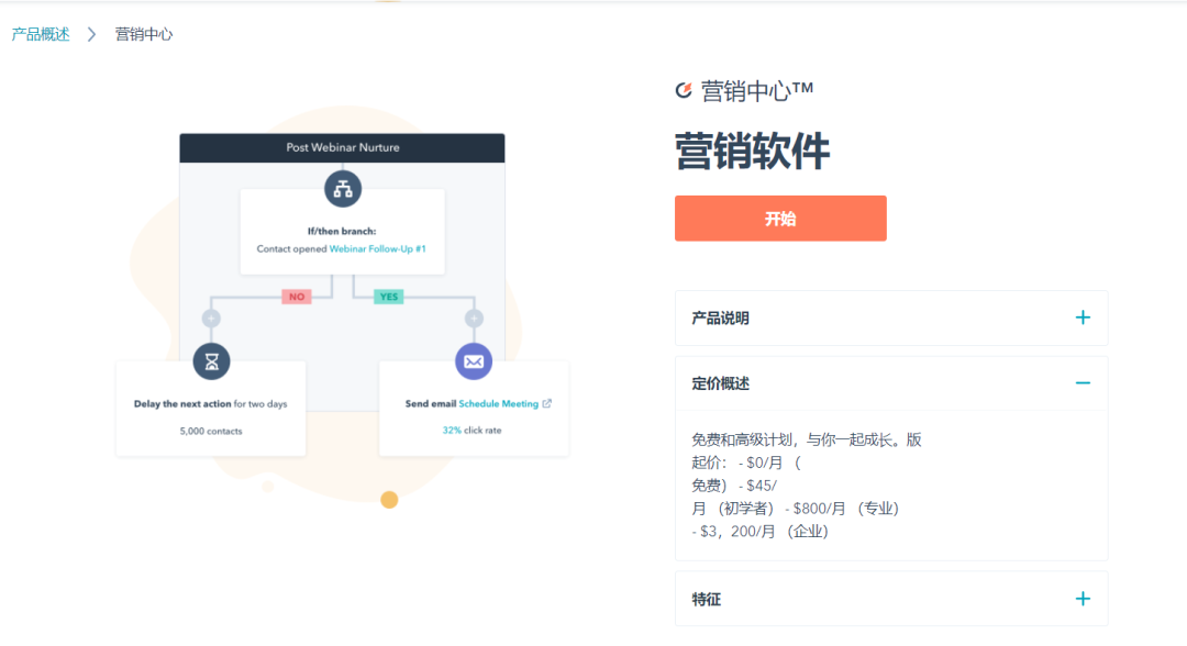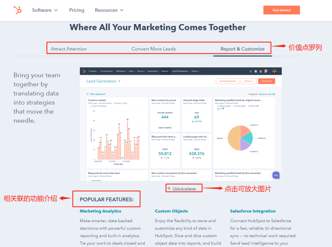 在官网页面的内容结构上,Hubspot尽可能将客户需要了解的信息,都在同一页面/屏内展示完整。