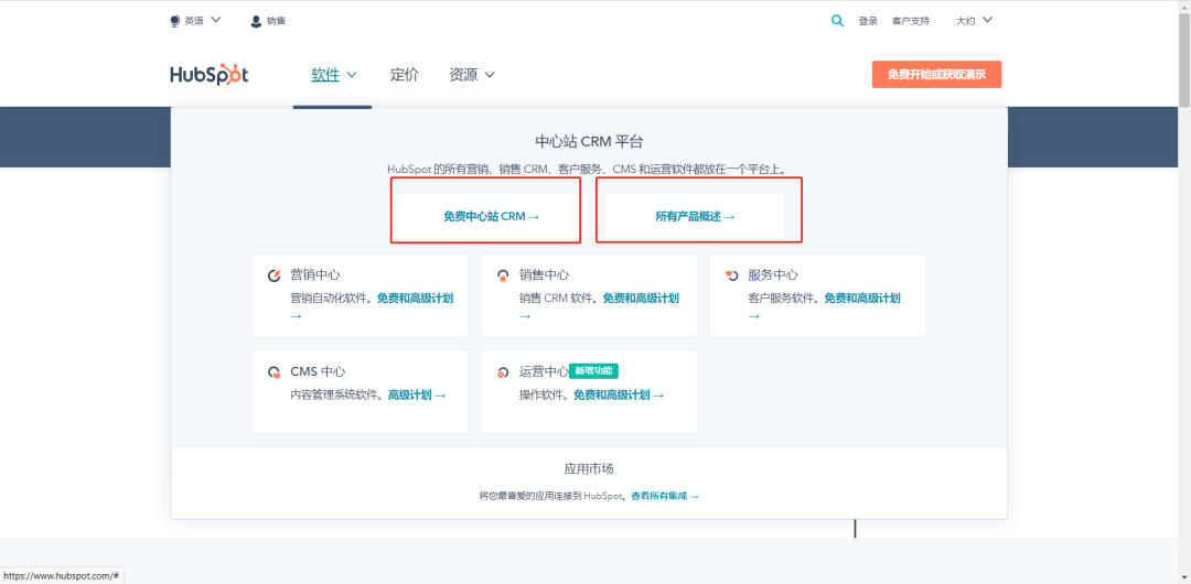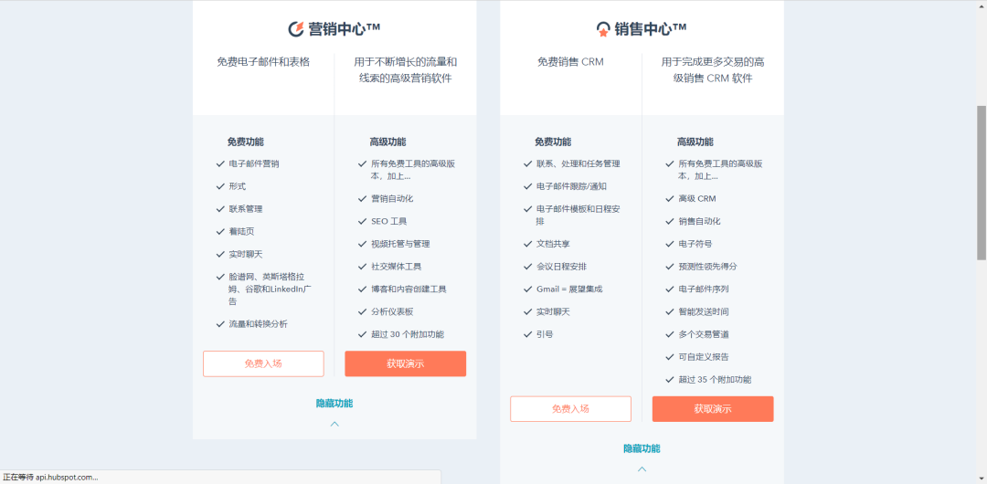 分模块:Hubspot按照产品线的分配逻辑,将免费的引流款产品(即:CRM系统)放在了第一列,其他模块的产品按照豆腐块排布,并且“把新增功能”的提示放在了重要位置,吸引用户点击。