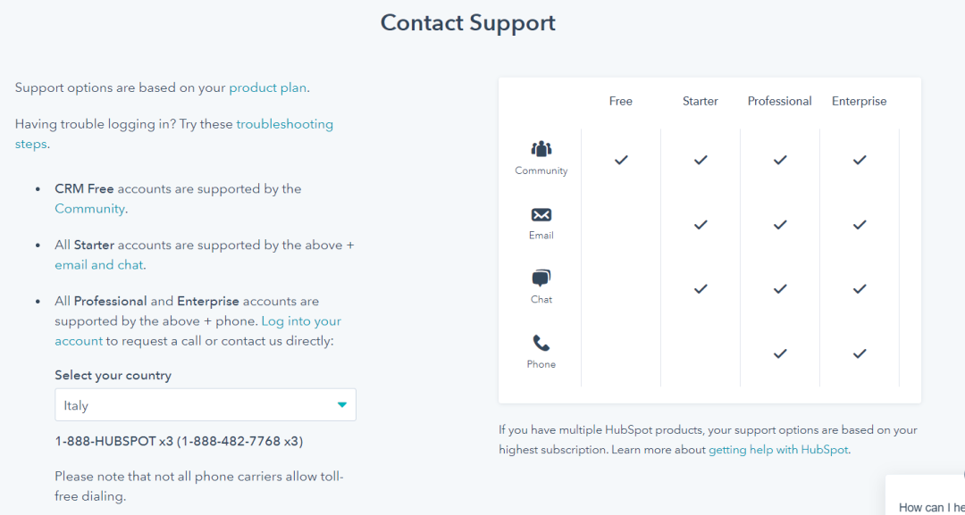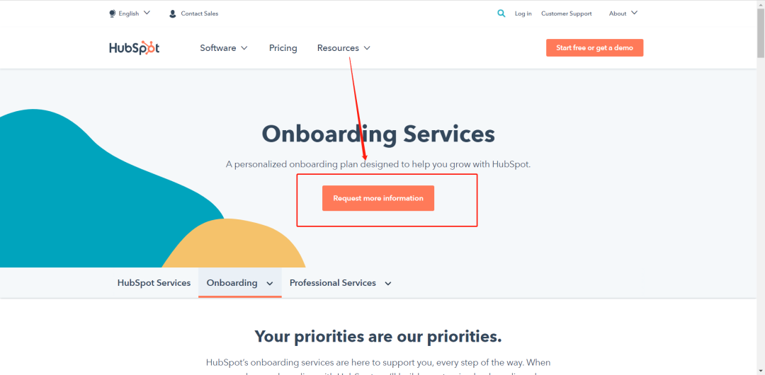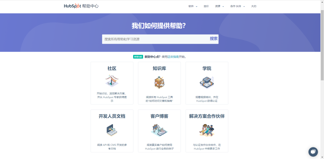 除了在【资源】子页面可以找到大量资源,Hubspot还将【客户支持】页面放在了首页右上角,作为明显入口。