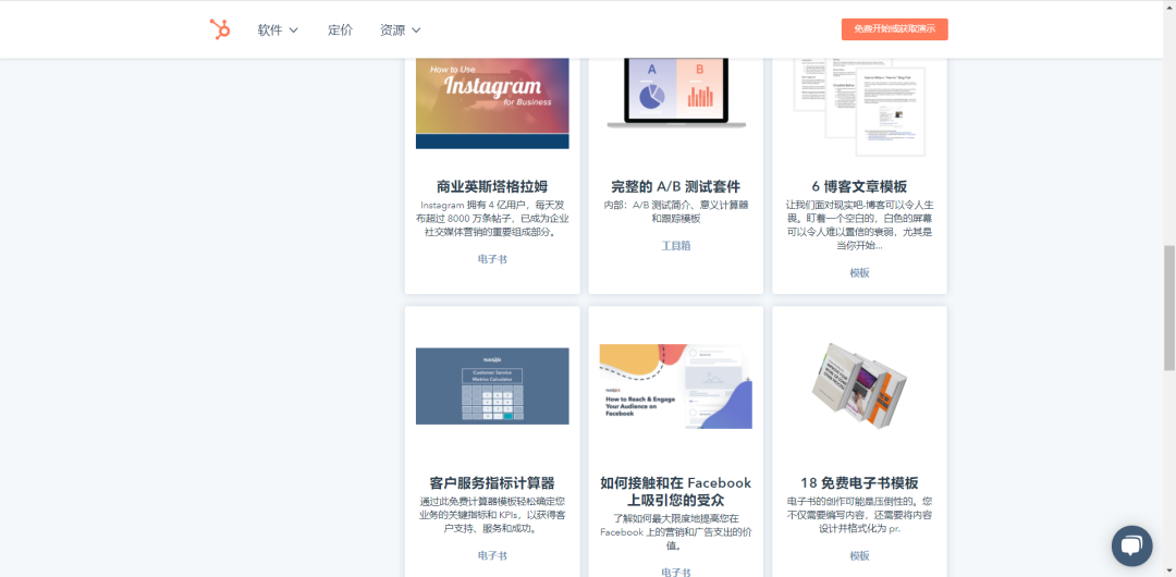 提供海量资源库,帮助客户打造自己的“内容营销”工具库。 在【资源】这一栏的子页面,可以看到有课程、电子书、文章、指南、模板、小工具箱、咨询服务,就像一个大型的电子图书馆,并且支持按照主题、内容类型进行智能搜索。