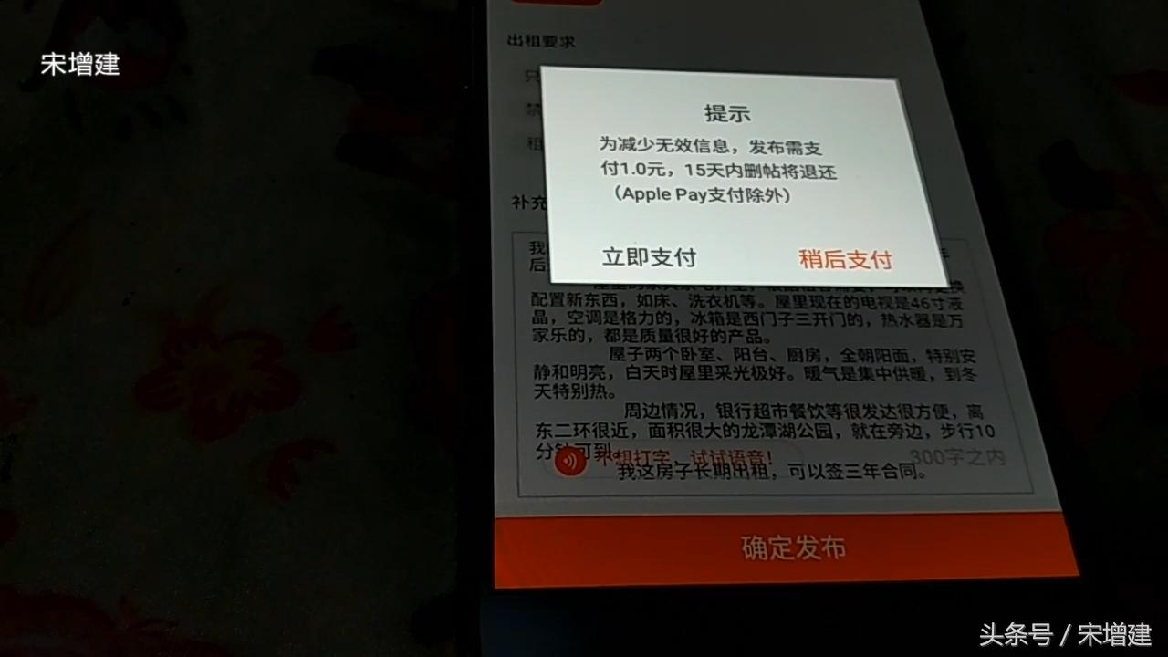 8、接着点“确定发布”,在发布时,为验证房东身份,发布者需要用微信或支付宝,先支付1元钱,作为身份验证的支付验证方式。如果15天内房子租出去,删除贴子,这1元钱还可以退还给发布的房东。