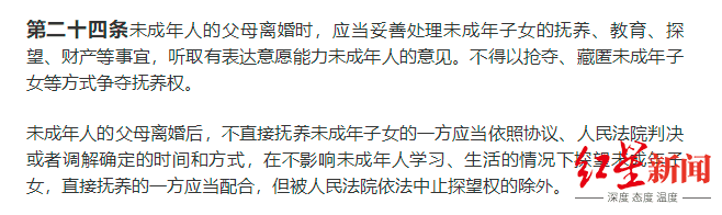 通过查询关键词,红星新闻记者了解到,在今年两会期间,全国人大代表、胜利油田采油工首席技师吴娟曾公开表示,中国离婚率持续攀升,起诉到法院的离婚纠纷,多数涉及孩子抚养权、探视权问题,也经常发生抢夺、藏匿孩子等行为。因此,她建议尽快完善解决离婚时藏匿孩子问题相关法律法规,保障未成年人合法权益,“建立相应法律法规,规定父母离婚过程中,任何一方不得抢夺、藏匿未成年子女,如导致未成年子女身心损害的,应受到法律制裁。”