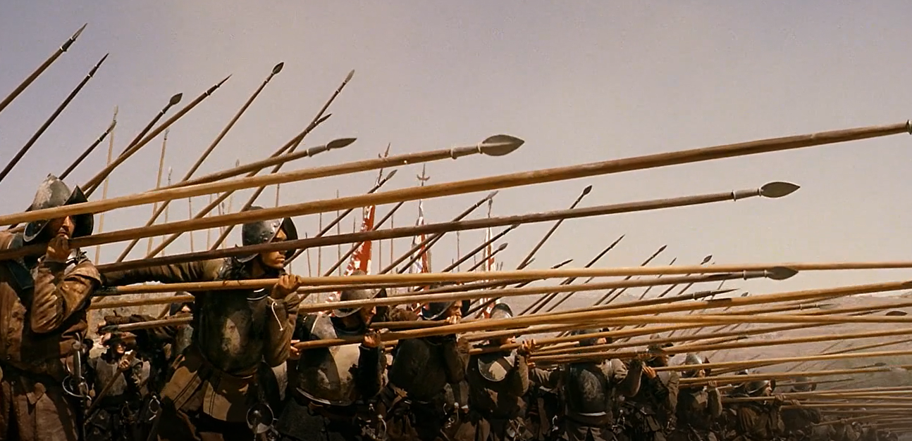 盛极一时的西班牙步兵大方阵(tericos),最典型的构成就是长矛兵和火枪兵。16世纪中期,西班牙长矛大致5.5米,而且永远不会少于5米,重量接近3.5公斤。在战斗中,长矛通常被垂直地扛在右肩上,直到冲锋陷阵的时候才被放下。