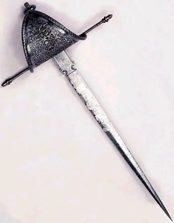 历史上刺剑虽然也用于实战,但它更多地是与宫廷、决斗和时尚联系在一起,因此刺剑的设计逐渐趋向于精细繁琐,图中明显主角的右手剑要比身边的普通战士的剑护手更加的华丽。