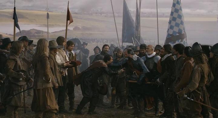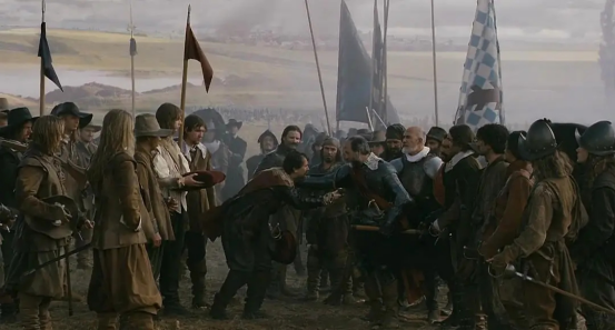 影片末尾,罗克鲁瓦战役中,男主角所在的弗兰德斯军团拒绝了法军的劝降,残存的军团士兵准备迎击法军骑兵的冲锋。男主和身边的战友高举的就是典型的西班牙cup-hilt(碗状)式刺剑。