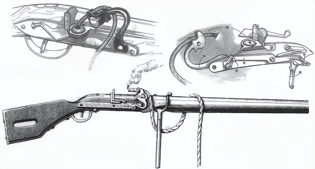 另外一个就是火绳枪。火绳枪大致在16世纪初出现了,重约5公斤,枪管长约1米,作为西班牙方阵中射击部队的常用武器。