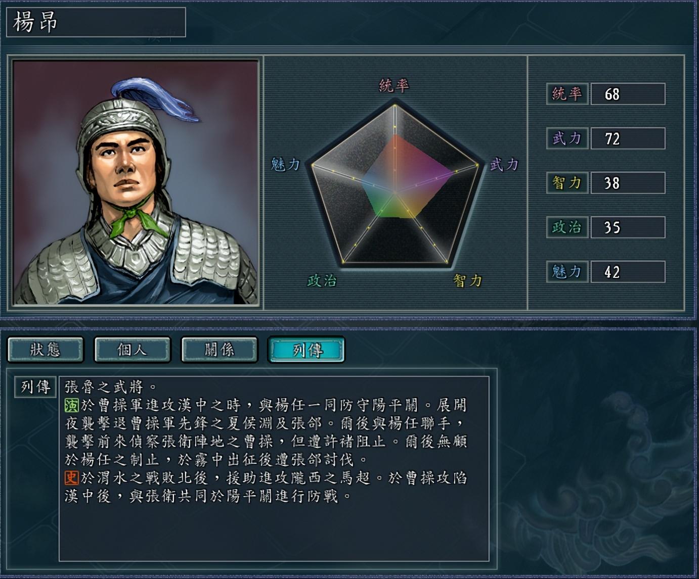 所以,综合张郃斩杨昂和夏侯渊斩杨任来判断,此战表现张郃稍强于夏侯渊。至于为什么在三国志11里,杨任的武力竟然高了杨昂6点,我不知道他们的依据是什么。