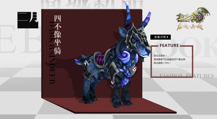鹿的犄角,马的脸部,牛的蹄子,驴的尾巴,这就是四不像的由来,虽然大家都知道其实古代神话当中的四不像就是麋鹿,但是人们还是根据描述,给四不像一个不一样的造型,四个动作搭配起来的四不像颇具特色。最近《龙之谷》上线的新坐骑四不像就是这样的,充满筋肉感的四肢再加上修长的身躯,除了拥有独一无二的外表之外,更是与众不同的自带了一身的盔甲。除了有着奇怪的外貌之外,还拥有着风驰电掣的速度,让人拍马莫及;这样一只灵兽,简直就是外出冒险必备良品啊!