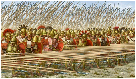 腓力二世在位期间,以传统的希腊重装步兵方阵为基础,结合了许多军事改革家的改革措施,创造了著名的马其顿方阵。马其顿方阵由步兵和骑兵共同组成,是一个合成方阵。步兵方面,与希腊方阵类似,步兵排成密集队形手持双手长矛作战(被称作萨里沙长枪,长13~14英尺(3-4米),双手操作,后期的超过18英尺(5-6米)。长矛末端有配重利于平衡,兼做长矛折断时之备用武器。)保持队形,徐徐前进。马其顿方阵正面密不透风。势不可挡。