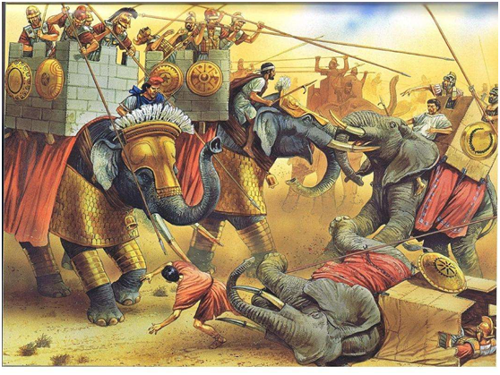 如果说塞琉古帝国对马其顿方阵的最大改进,就是引进了战车和战象,充当突击力量,在亚历山大东征期间,波斯人和印度人就采用战象作战,给马其顿军队以深刻印象。这一特点也为塞琉古继承,当时在印度,饲养孔雀家族出身的旃陀罗笈多(月护王)建立孔雀王朝,驱逐当地的马其顿——希腊军队,并占领印度河河谷和亚历山大大帝在最东方的其它地区,于是塞琉古一世开始展开远征与旃陀罗笈多开战,双方互有胜负,最后在前303年签署和约,和约中塞琉古把大片土地(差不多是今日的阿富汗、印度河以西的部分伊朗,)割给孔雀王朝来交换500头战象,保持和平,随后塞琉古繁育这些战象,组建了庞大的战象部队。塞琉古帝国的战象背上装有一座塔楼,上面往往有一名长矛手和弓箭手(或者投枪手),塔楼前面有驭手,许多印度人在塞琉古帝国军队象兵中服役,充当驭手,皮环和金属铠甲也被装备在大象身上,成为所谓“重甲战象”,战象部队需要轻装步兵部队随行保驾,这些轻装部队也成为塞琉古军队中的固定编制。在拉菲亚会战中,塞琉古军队出动100多头大象,在前190年的马格尼西亚会战中,塞琉古军队也出动了54头战象。
