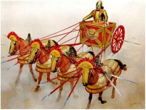 战车也是塞琉古军队中的秘密武器,战车在很早就被西亚各民族使用,在前332年的高加米拉会战中,波斯军队就使用了所谓“卷镰战车”(Chariot),这种重型战车车轮上有威力巨大的长刀,且马匹身上也披覆铠甲,冲锋威力极为恐怖,真可以说是“势如奔雷,刀光相映,百万之师,溃不成军” 据圣彼得堡国立大学历史科学博士涅费德金(Нефёдкин)考证,卷镰战车实际上应当出现于波斯王阿尔塔薛西斯一世统治时期(公元前465-424年),它是波斯人两次远征希腊失利后,波斯帝国应对希腊式密集重步兵队形的产物。卷镰战车完全取消了车载战斗人员,仅仅保留披甲驭手,因此,其杀伤力完全源自从车轴伸出的镰刀和战车本身的冲击力。若是面对来去如风、队形松散的轻步兵或轻骑兵,卷镰战车当然很难发挥作用,甚至可能在对方的投射打击下帮上倒忙。于是,它几乎惟一的作战方式就是在适合驰骋的平坦战场上冲击缺乏得力投射兵种辅助的重步兵集群。公元前301年,在决定亚历山大帝国瓜分命运的伊普苏斯战役中,取得最终胜利的塞琉古军队便出动了至少100辆卷镰战车。直至罗马人一统地中海为止,卷镰战车都在帝国的大小交战中扮演过种种重要角色。