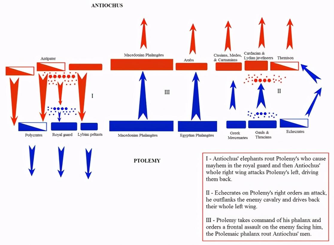 拉菲亚会战((红色 塞琉古 蓝色 托勒密 实心为步兵 空心为骑兵)
