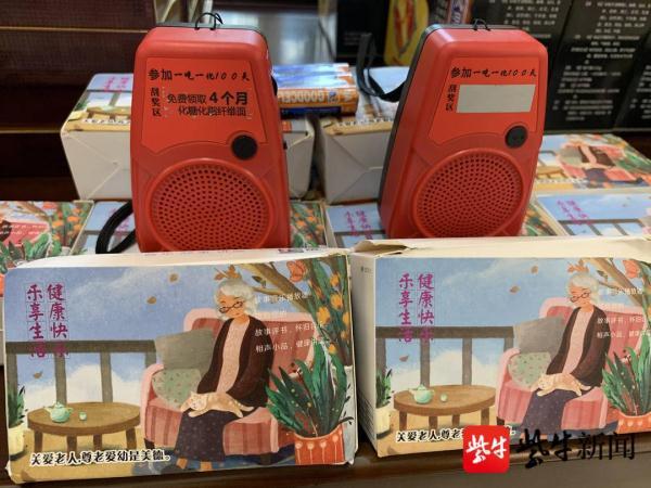 王雯武一边阅读手册,一边收听评书机。在健康手册的封面上,醒目地写有“一吃一化一百天,化糖化脂化血毒”标语,另外还标出2个补贴,即“补贴一:免费领取4个月化糖化脂纤维面”、“补贴二:额外免费领取1个月中药紫苏油”。