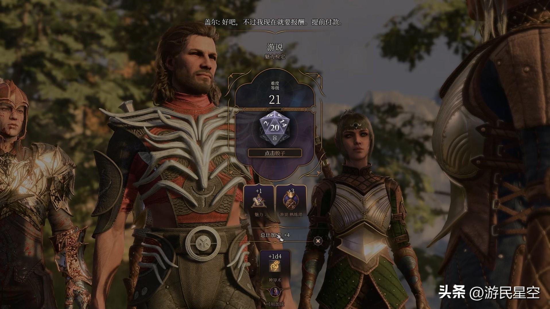 《博德之门3》为玩家提供了不少能提升角色扮演沉浸感的机制,你在与他人进行交涉,或是属性检定时,都会在屏幕上出现一个经典的20面骰,由你自己手动投出来决定最终结果。当你选择了与你身份、背景符合的对话时,都会被系统判定为优秀的角色扮演行为,给予你可以重扔骰子的激励点和经验作为奖励。