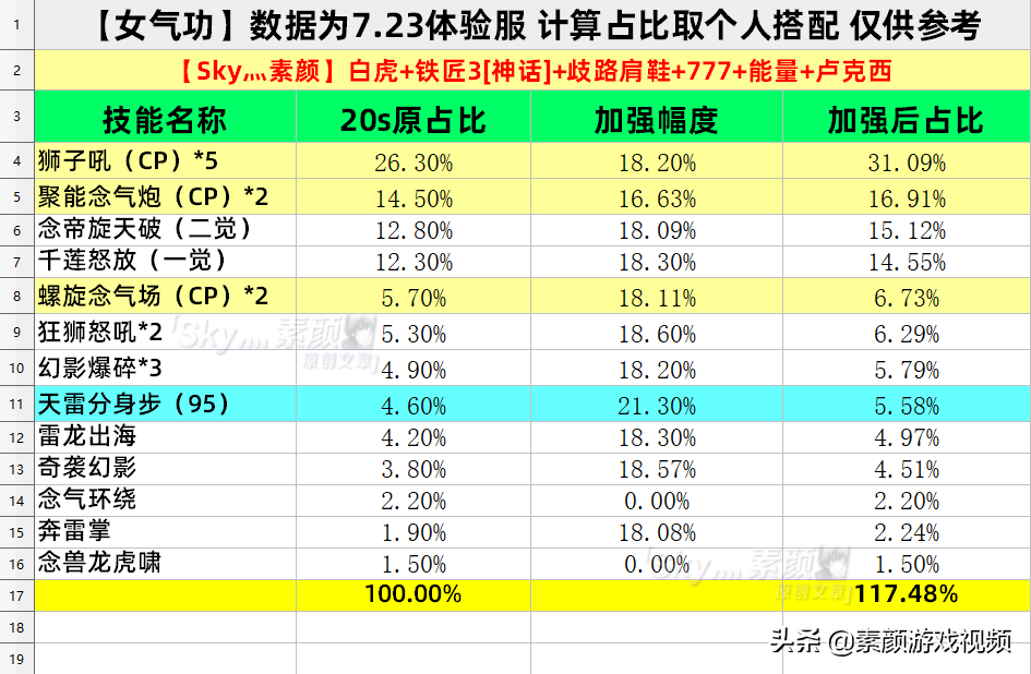 女气功的数据也比较简单,平均加强幅度在18%上下,[95主动]单独加强21.3%;另外猫拳与环绕无加强,但在这个[狮子吼]续航的环境下影响也不大。按个人20s占比计算,提升为17.48%。中规中矩,可以接受。