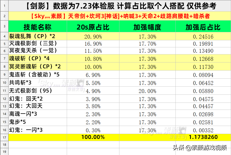 剑影这个加强虽然也有些敷衍,但和阿修罗相比,我反而觉得比较正常。数据也挺好理解的,[95主动]单独提升了20%,其余技能均为17.3%,20s打桩提升约为17.38%。 加强之后的职业数据还是很一般,但剑影是个实战向职业,可能策划目前不会给这类职业太高的数据吧。至于满意度如何,仁者见仁,个人勉强可以接受(主要是有对比衬托)。