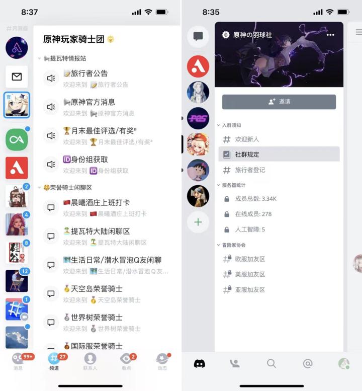 手机界面上,「QQ 频道」和 Discord 都是左列图标的布局设计;功能上,二者都支持文字语音聊天、自定义频道、添加聊天机器人。