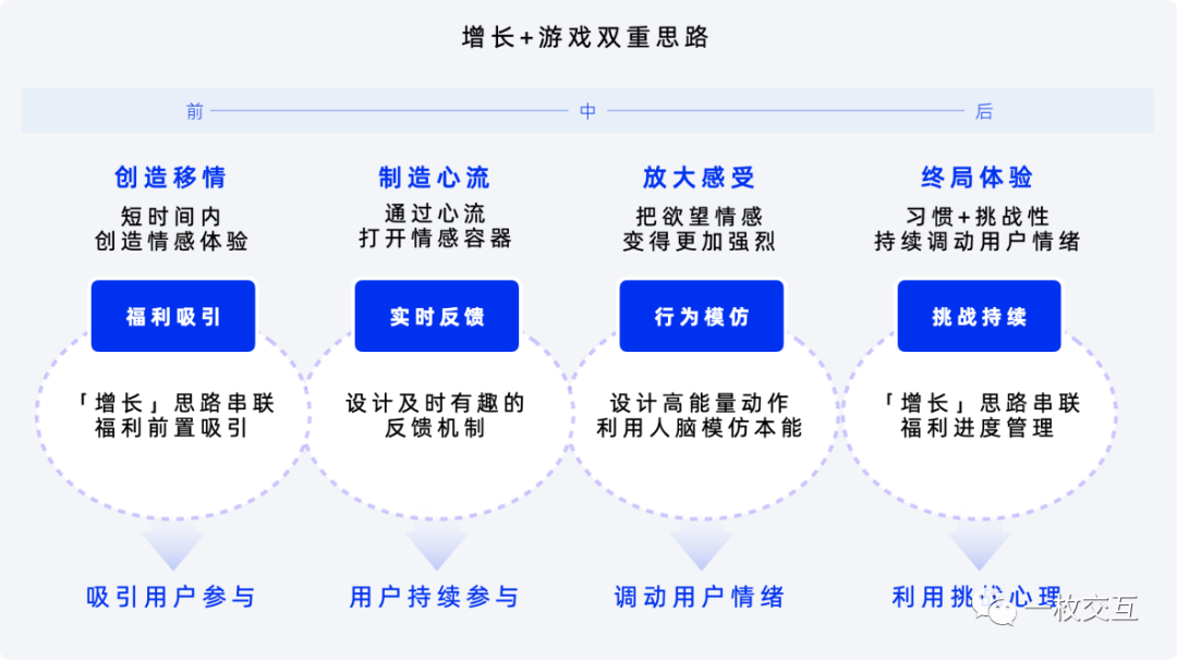 把游戏如何在短时间内让用户上瘾的思路和增长活动按照用户参与活动的前中后结合;参与活动前通过福利吸引用户的注意力,调动用户情绪,吸引用户点击参与活动;活动过程中设计及时有趣的动效反馈加上重复的动作让用户进入心流模式,离开活动时用挑战心理持续调动用户参与活动的情绪,继续留下。
