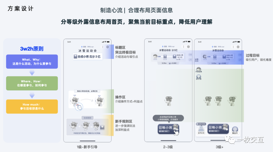 遵循3W2H原则对活动页面分3个部分设计,因活动区分多个等级,在页面设计上也按照不同等级对应不同的用户心理给出方案;新用户进入活动后,通过「头部标题区」先告知用户这是什么活动,参与活动能得到什么,在标题区域突出活动的终极目标,也就是福利信息用来吸引用户注意力增加用户继续玩下去的动力,「操作区」通过新手引导动画拆解动作,一步一步告知用户该如何操作;页面下方介绍升级的方式也就是玩法的核心操作。