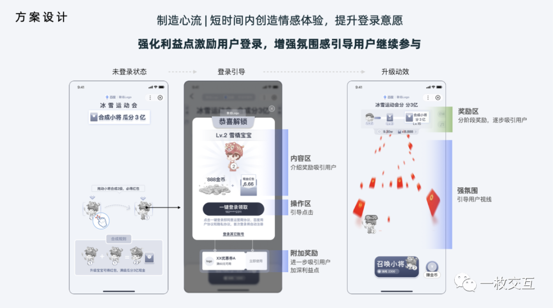 所以在登录相关需要用户操作且有一定成本的节点,先以活动自身游戏的天然吸引力打动用户,同时登录时用奖励信息引导用户点击登录,“双重诱惑”下完成登录转化,完成登录行为后以动效+音效的方式引导用户视线看到奖励稳定入口处,行云流水一气呵成。