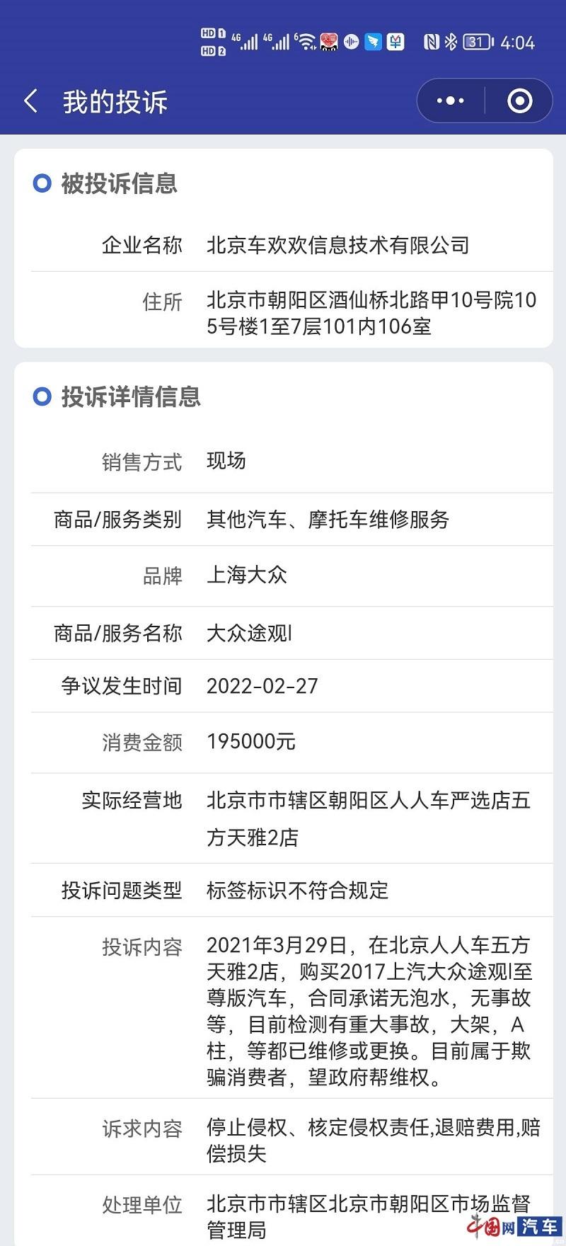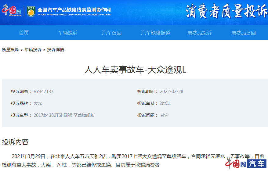 近日,中国网汽车质量投诉平台就收到了车主陈先生对于人人车二手车交易平台的投诉。据车主称,他于2021年3月在北京人人车五方天雅2店购买了一辆2017款上汽大众途观至尊版汽车,当时合同承诺无泡水、无事故等。
