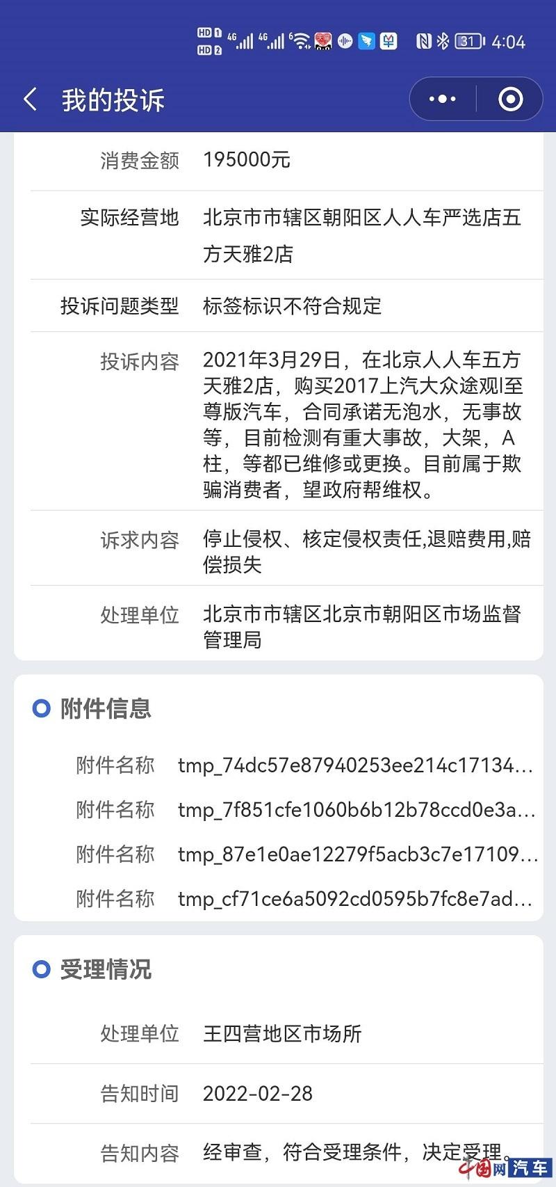 随即,陈先生联系了当时购车的人人车,对方回复:该车并非事故车,且没有在人人车复检,因此不承认上述检测结果。在陈先生的要求下,人人车方面派相关工作人员来为车辆进行了复检,但检测结果依旧是:“不是事故车,不存在上述情况。”当记者询问人人车方面是否为复检出具相关检测报告时,陈先生表示,“并没有,只是口头结论”。对此,陈先生表示无法接受,并已投诉至相关市场监督机构,目前,该投诉已被受理。