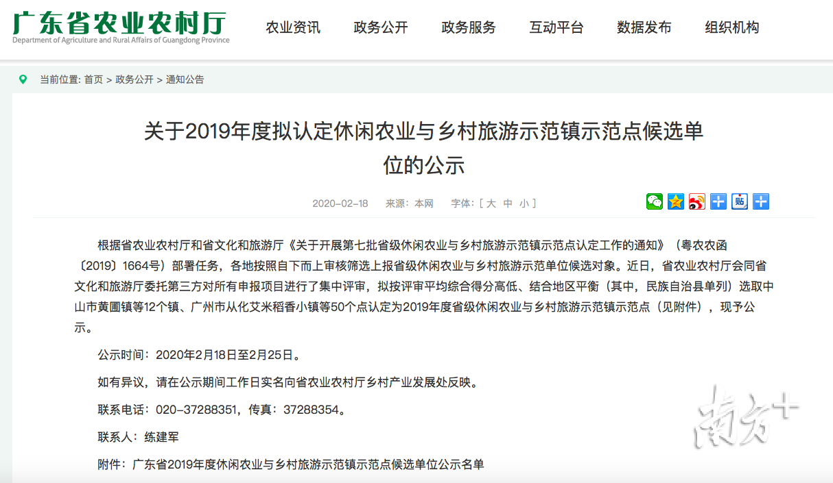 近日,省农业农村厅会同省文化和旅游厅委托第三方对所有申报项目进行了集中评审,拟按评审平均综合得分高低、结合地区平衡(其中,民族自治县单列)选取中山市黄圃镇等12个镇、广州市从化艾米稻香小镇等50个点认定为2019年度省级休闲农业与乡村旅游示范镇示范点,并在2月18日至2月25日期间予以公示。