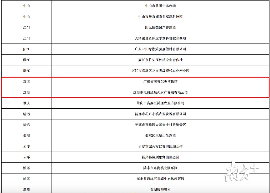 2月18日,广东省农业农村厅对2019年度拟认定休闲农业与乡村旅游示范镇示范点候选单位进行公示。其中,茂名滨海新区博贺镇 入选“广东省休闲农业与乡村旅游示范镇”,广东省南粤沉香博物馆、茂名市电白区星火水产养殖有限公司 入选“广东省休闲农业与乡村旅游示范点”。