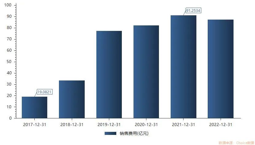 “买量大户”成就了企业的王者规模,也导致了销售费的居高不下。从2017年的19.08亿元,一路攀升到2021年91.25亿元的高点。即使2022年出现7年来的首次下降,规模仍达87.33亿元,占收入比达53.23%。其中,互联网流量费为81.70亿元。