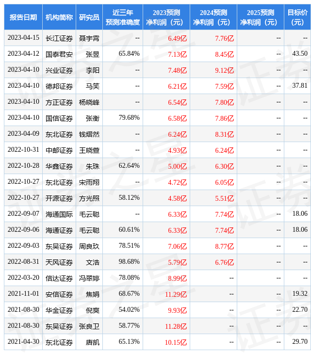证券之星数据中心根据近三年发布的研报数据计算,东北证券钱熠然研究员团队对该股研究较为深入,近三年预测准确度均值为79.87%,其预测2023年度归属净利润为盈利7.55亿,根据现价换算的预测PE为16.43。