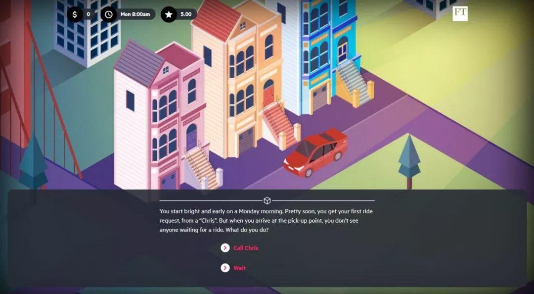 2017年10月,英国《金融时报》在零工经济的背景下推出一款体验做Uber司机的游戏。游戏由制作者通过采访大量Uber司机、利用所得数据设计而成。