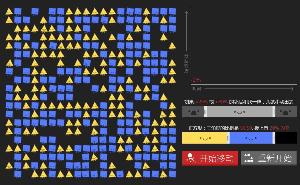 玩家通过非常简单的操作,就可以一步一步地了解:即使每个图形只有那么一点点的小的偏见,这个图形社会的分裂就会越来越严重,社会就会变得支离破碎。