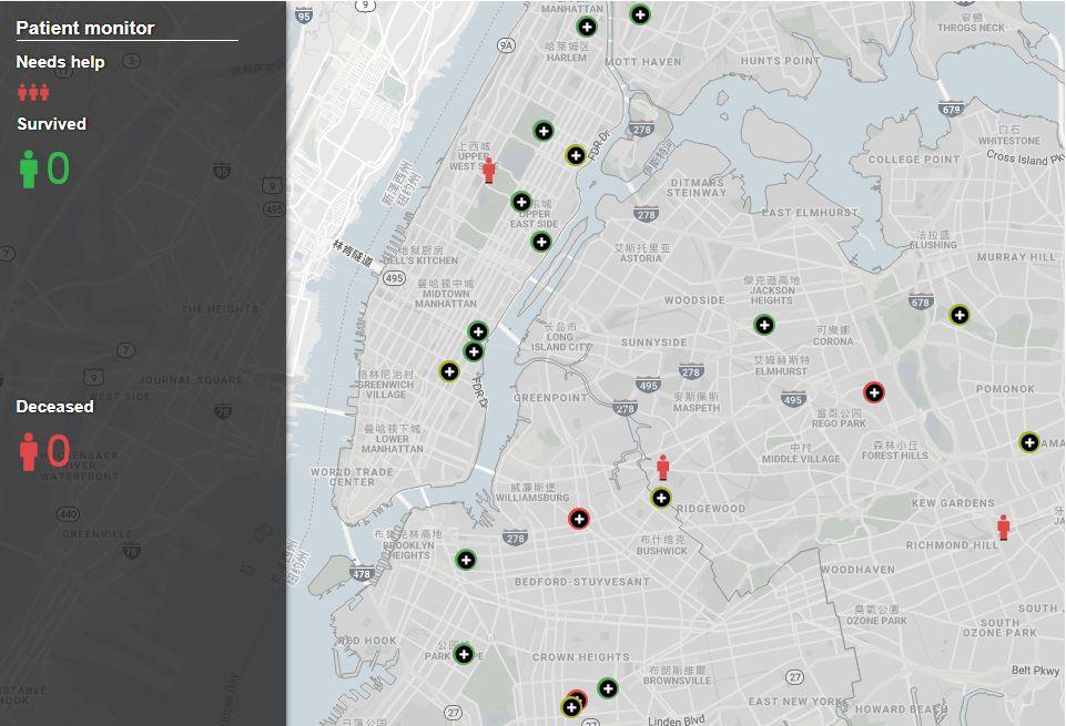 映入眼帘的是一张纽约市地图,黑色圆圈标注了各个医院的位置。突然,有红色小人掉落在地图上,它代表着心脏病突发患者,你必须通过“拖动鼠标”把小人送到最近的医院,患者才能及时得到救治。