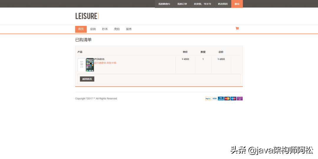 用户模块订单模块商品模块管理员模块后台管理员发布商品,前端用户登录即可预览商品,进行下单。