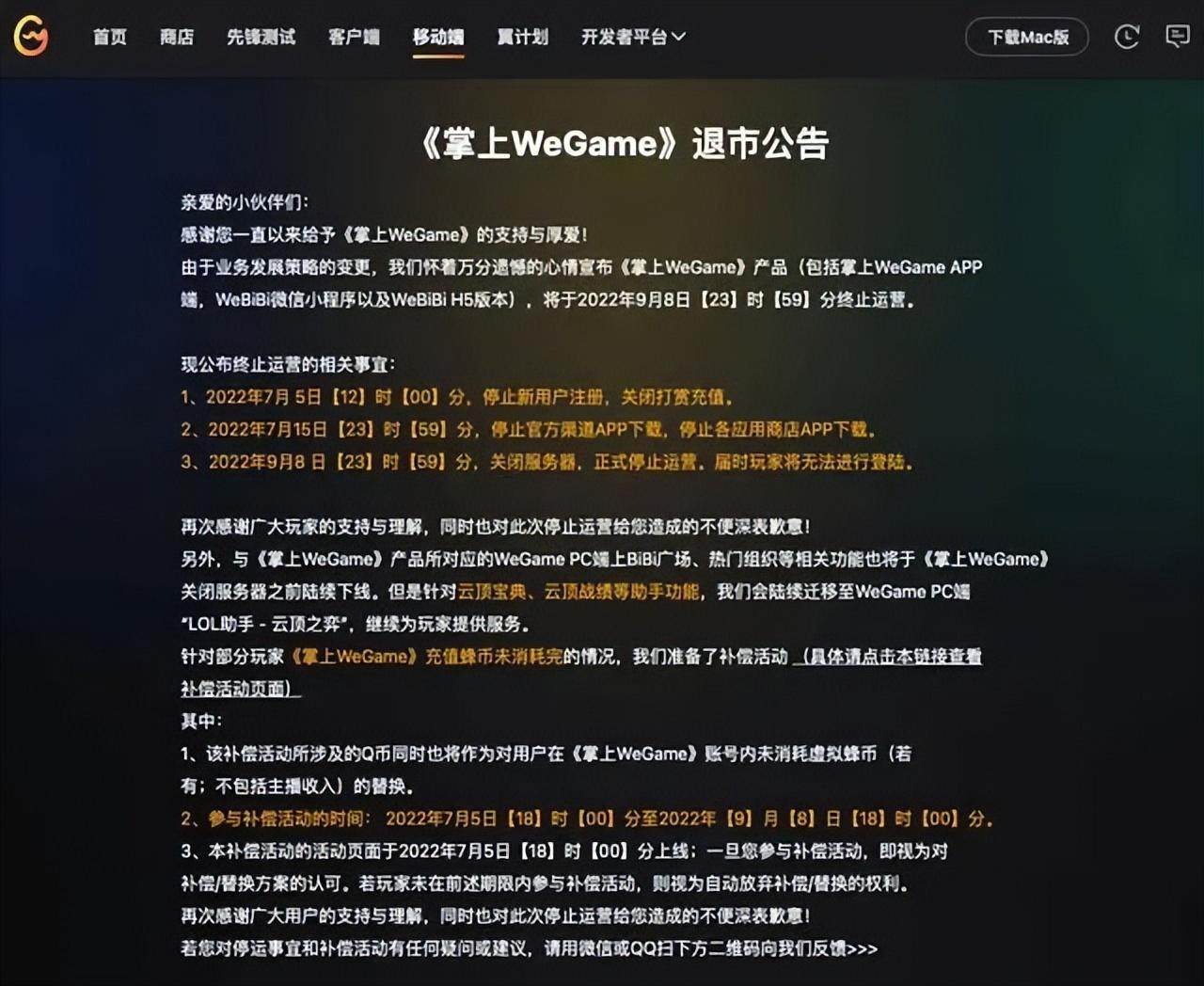 公告显示掌上 WeGame 将于 2022 年 9 月 8 日【23】时【59】分终止运营。