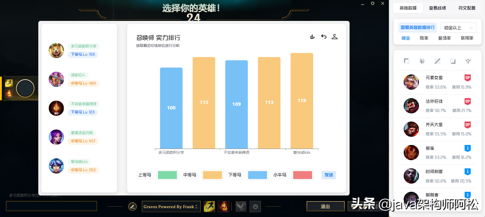 鼠标右键点击右下角的Frank图标----->点击显示助手 再次同样的操作即可隐藏页面当你开始一局游戏的时候, 处于选择英雄的阶段, 会自动弹出此页面@数据来源 英雄联盟国服官方数据中心