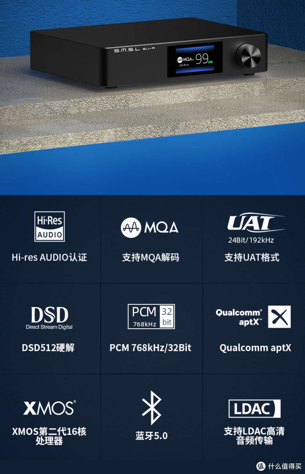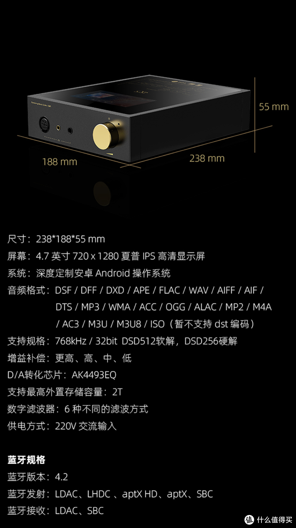 这是一款使用ES9038pro芯片纯DAC,第二代XMOS16核处理器,UATLDAC高清蓝牙传输,通过Hi-res AUDIO认证,带屏幕、调节旋钮、遥控器,配置豪华。